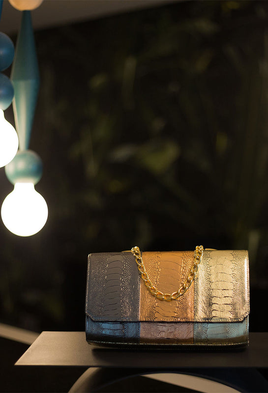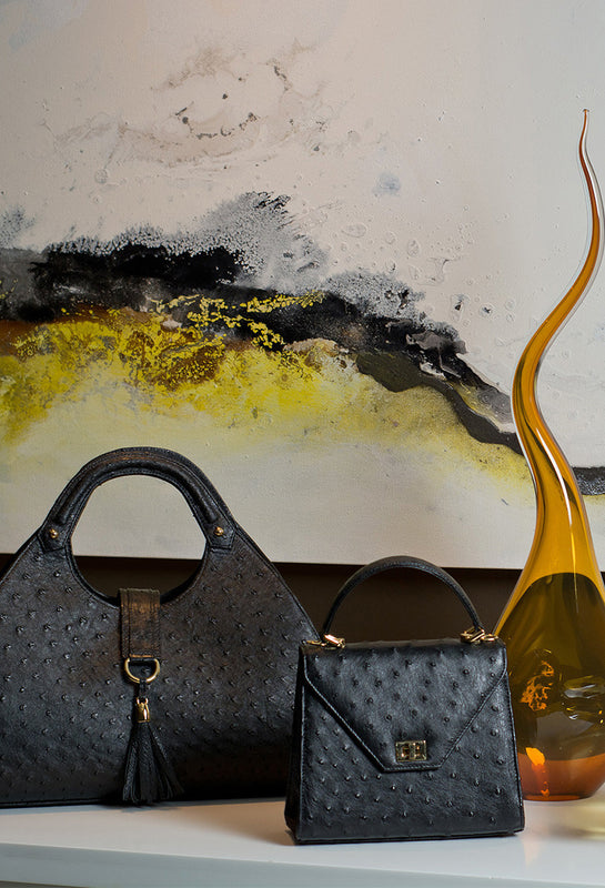 Each Adéle handbag, purse or travel bag is a work of functional art that is crafted in South Africa with meticulous care and attention to detail. These classic, timeless pieces are handmade from quality exotic leathers such as ostrich leather, crocodile hide, printed bovine and embossed leather to produce elegantly sculptured handbags. Skilled artisans hand cut, hand/machine stitch and hand dye the leathers in a wide spectrum of colours; from classic neutrals to vibrant shades like hot pink and emerald green. The gold plated or nickel fittings are either of Italian origin or are custom designs cast by local foundries. Adéle handbags are unique, limited editions designed to evoke an enduring sense of beauty, style and functionality.