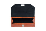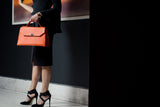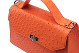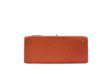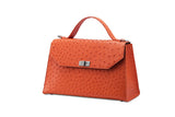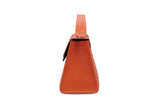 Buffalo leather constructed top flap handbag with turn lock. Top handle with adjustable detachable shoulder strap with snap hooks. High quality black leather interior contains an inside zip pocket with one internal patch pocket. The bottom panel features bag feet studs.
