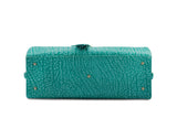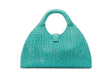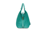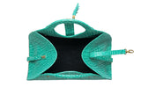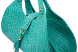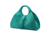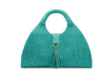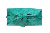 Leather bag with fold over hidden magnet strap with D-ring & tassel decoration for closure. Attached round shaped handles decorated with two studs. Internal zip pocket with two internal patch pockets. Black high quality leather lining.  Bag feet.