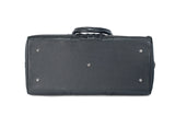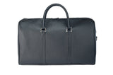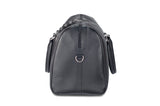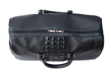 Black Bovine leather duffel bag with crocodile tail insert. Double zipper and double carry handle with nickel hardware. Comes with an adjustable and detachable shoulder strap. Black cotton twill lines the bag interior, which also features an inside zip pocket and two open pockets.