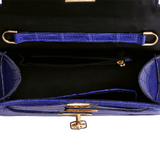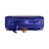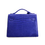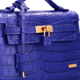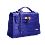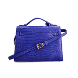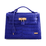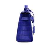 Kelsey blue nile crocodile leather constructed top flap handbag with a Pop-up top handle and a adjustable detachable shoulder strap. Bag sports a lock and key in 24 carat gold plated. The bag contains an inside back zipper pocket and lined with high quality leather. The bottom panel features bag feet studs.