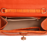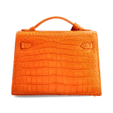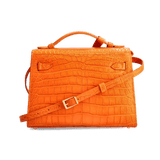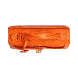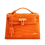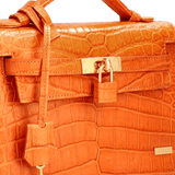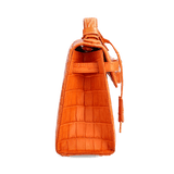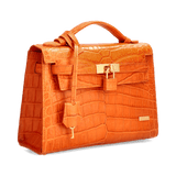 Kelsey orange nile crocodile leather constructed top flap handbag with a Pop-up top handle and a adjustable detachable shoulder strap. Bag sports a lock and key in 24 carat gold plated. The bag contains an inside back zipper pocket and lined with high quality leather. The bottom panel features bag feet studs.