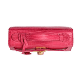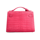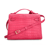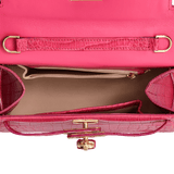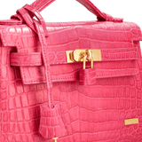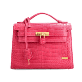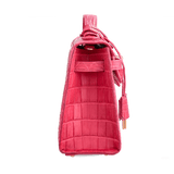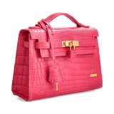 Kelsey pink nile crocodile leather constructed top flap handbag with a Pop-up top handle and a adjustable detachable shoulder strap. Bag sports a lock and key in 24 carat gold plated. The bag contains an inside back zipper pocket and lined with high quality leather. The bottom panel features bag feet studs.