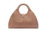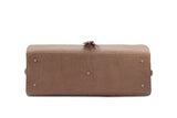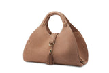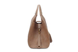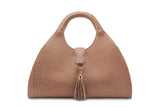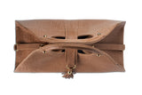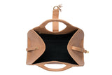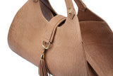 Leather bag with fold over hidden magnet strap with D-ring & tassel decoration for closure. Attached round shaped handles decorated with two studs. Internal zip pocket with two internal patch pockets. Black high quality leather lining. Bag feet.