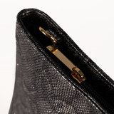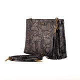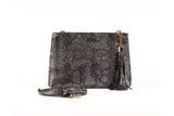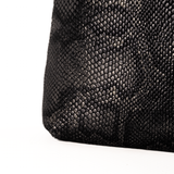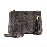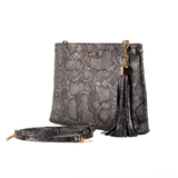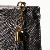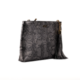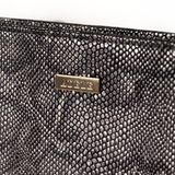 Silver snake printed leather clutch bag from the Adele Exclusive Luxury Design Handbag Collection. 24 carat gold plated decorative hardware with a detachable shoulder strap. Top zipper closure with inside back zipper pocket, suede leather lining and top zipper.