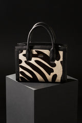 Black and white zebra printed hair on hide front panel with leather side, back and bottom. Top zipper closure with an inside back-zip pocket. The bag interior consists of high-quality leather lining.The bag sports a detachable shoulder strap with an adjustable buckle. Bag feet studs are located on the bottom panel. Handle drop 10cm.