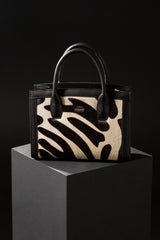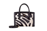 Lauren - Small top handle tote bag, zebra printed hair on hide and black leather
