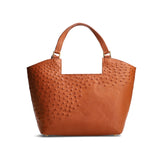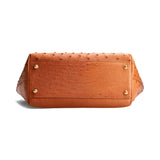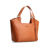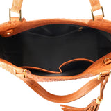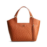 Brown ostrich leather Tote Bag leather lined with top zipper closure, insider back zipper pocket with two big inside pockets. Two leather handles with decorative sqaure 24 Carat gold plated hardware and a detachable adjustable shoulder strap. Decorative tassel with tassel cap.