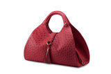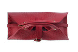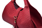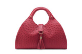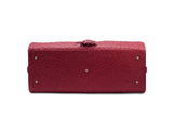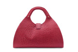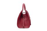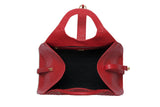 Leather bag with fold over hidden magnet strap with D-ring & tassel decoration for closure. Attached round shaped handles decorated with two studs. Internal zip pocket with two internal patch pockets. Black high quality leather lining. Bag feet. Size: 26.5 cm H x 40.5 cm L x 14 cm W