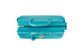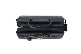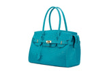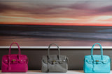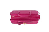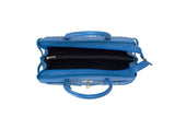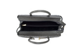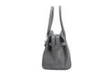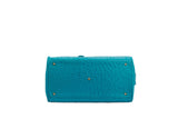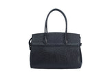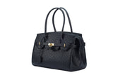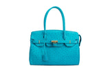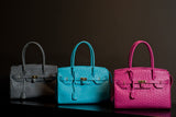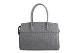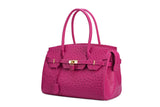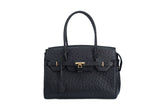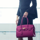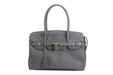 The ostrich leather Sandi is designed with a look after the famous Birkin bag but with a comfortable top zip for comfortable access. The interior contains an inside zip pocket with two internal patch pockets, and is lined with high quality black suede leather. Features a double handle and a gold lock system as decorative hardware. Bag feet studs are located on the bottom panel of the bag.