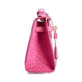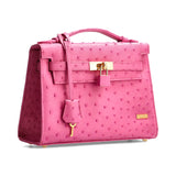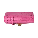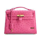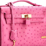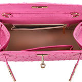 Kelsey Cyclamen pink ostrich leather constructed top flap handbag with a Pop-up top handle and a adjustable detachable shoulder strap. Bag sports a lock and key in 24 carat gold plated. The bag contains an inside back zipper pocket and lined with high quality leather. The bottom panel features bag feet studs.