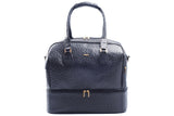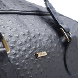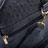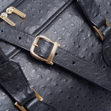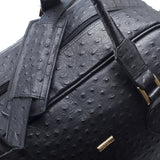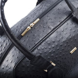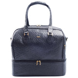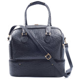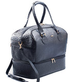 Embossed or Ostrich leather Double Decker Duffel Bag, top panel includes a double zipper and attached double carry handle with clip closure for comfort. Side zipper pockets and bottom compartment with zipper closure. Comes with an adjustable and detachable shoulder strap. Black suede lines the bag interior, which also features an inside zip pocket and open pockets.