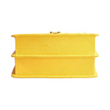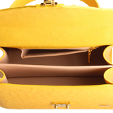 Medium size, Sun yellow ostrich leather constructed top flap handbag with a double gusset, 24 carart gold plated hardware and Italian lock closure. Contains an inside back zipper pocket and high quality napa leather lining on bag interior. Includes a detachable adjustable shoulder strap. Size: 17cm H x 23cm L x 12cm W