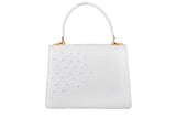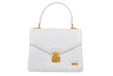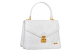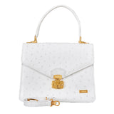 White ostrich leather constructed top flap handbag with a double gusset, top handle, 24 carart gold plated hardware and Italian lock closure. Contains an inside back zipper pocket and high quality leather lining on bag interior. Includes a detachable adjustable shoulder strap. Size: 17cm H x 23cm L x 12cm W