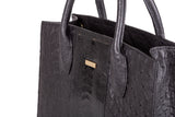 Black ostrich and ostrich shin leather, top handle tote bag. Top zipper closure with an inside back-zip pocket. The bag interior consists of high-quality leather lining.The bag sports a detachable shoulder strap with an adjustable buckle. Bag feet studs are located on the bottom panel.