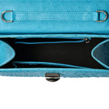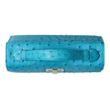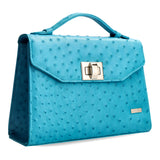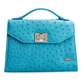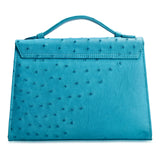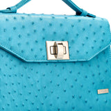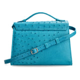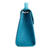 Kelly turchese (turquoise) ostrich leather constructed top flap handbag from the Adele ostrich leather collection. Bag sports a Pop-up top handle and a adjustable detachable shoulder strap with a Italian nickel turn lock. The bag contains an inside back zipper pocket and lined with high quality leather. The bottom panel features bag feet studs.