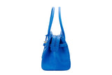 The ostrich leather Sandi is designed with a look after the famous Birkin bag but with a comfortable top zip for comfortable access. The interior contains an inside zip pocket with two internal patch pockets, and is lined with high quality black suede leather. Features a double handle and a gold lock system as decorative hardware. Bag feet studs are located on the bottom panel of the bag.
